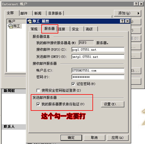 第九步:重點:鏈接"服務(wù)器"然后打上"我的服務(wù)器要求身份驗證"勾