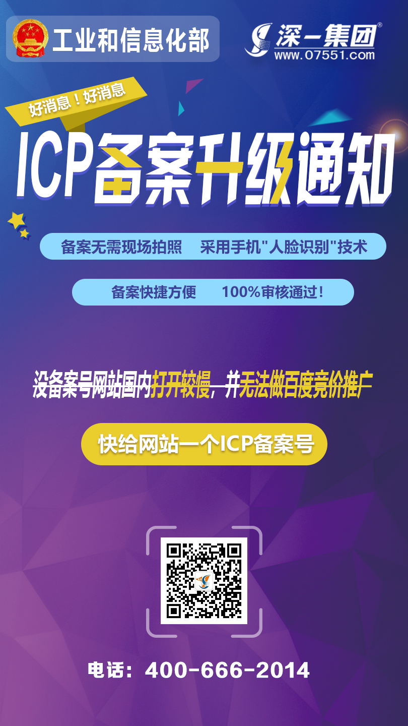[深一ICP備案]好消息!ICP網(wǎng)站備案升級啦!備案無需現(xiàn)場拍照,直接采用手機(jī)"人臉識別"技術(shù);備案快捷方便,100%審核通過;沒備案號網(wǎng)站國內(nèi)打開較慢,并無法做百度競價推廣。詳細(xì)備案咨詢深一商務(wù)!